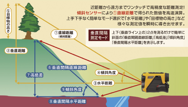 測定項目は多岐に渡り、直線距離だけではなく、傾斜角度・水平距離・垂直、目標物の高さ、2点間の垂直ライン上の直線距離・高低差・水平距離を瞬時にワンボタンで測定します
