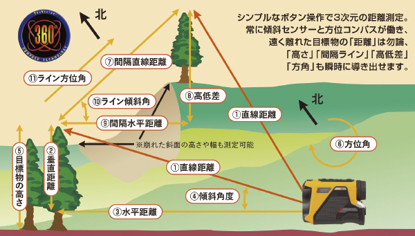 実にシンプルなボタン操作で距離・高さ・角度・方位など11種類の測定が可能。