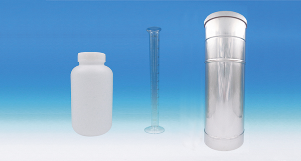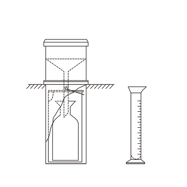 受水口から入った雨水は雨量計内部にセットした貯水瓶に溜まり、その瓶を取り出して雨量升で雨量を計測します。